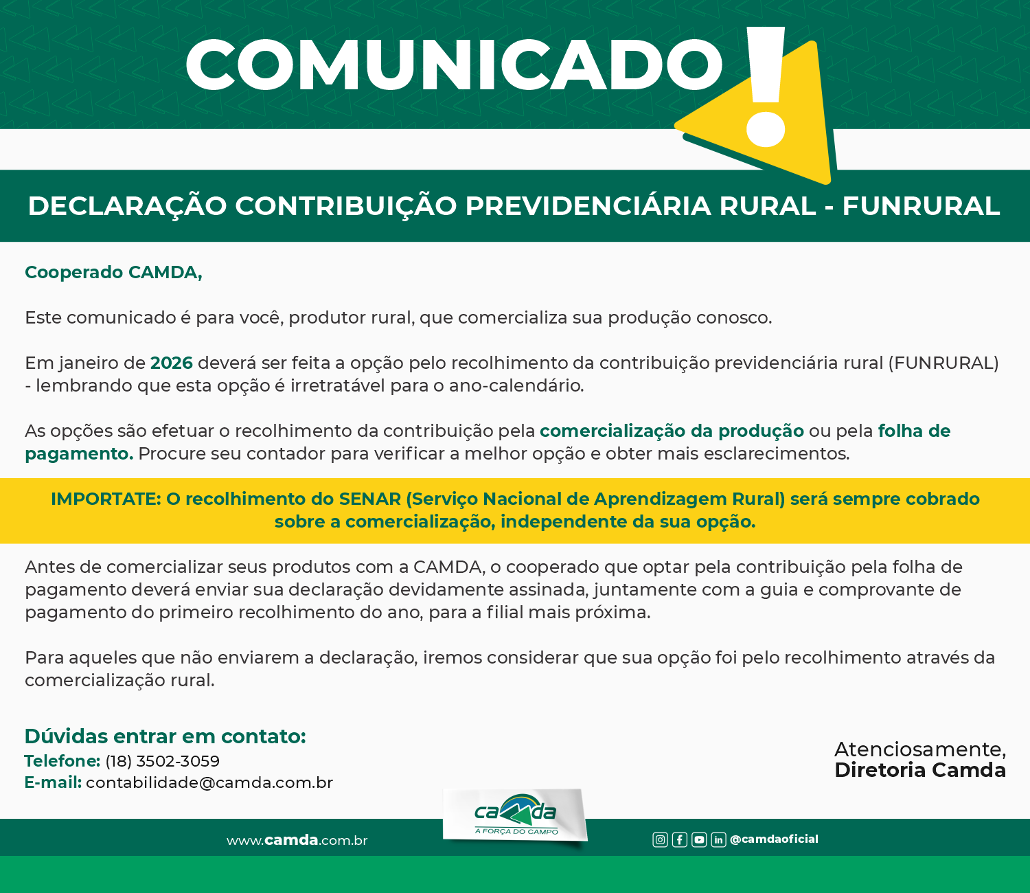 Unir forças para alcançar propósitos maiores: este é um dos objetivos do cooperativismo. E a Camda busca sempre este ideal na realização de suas ações junto aos associados. Seja você também um cooperado: procure uma de nossas filiais e faça parte da força do campo!